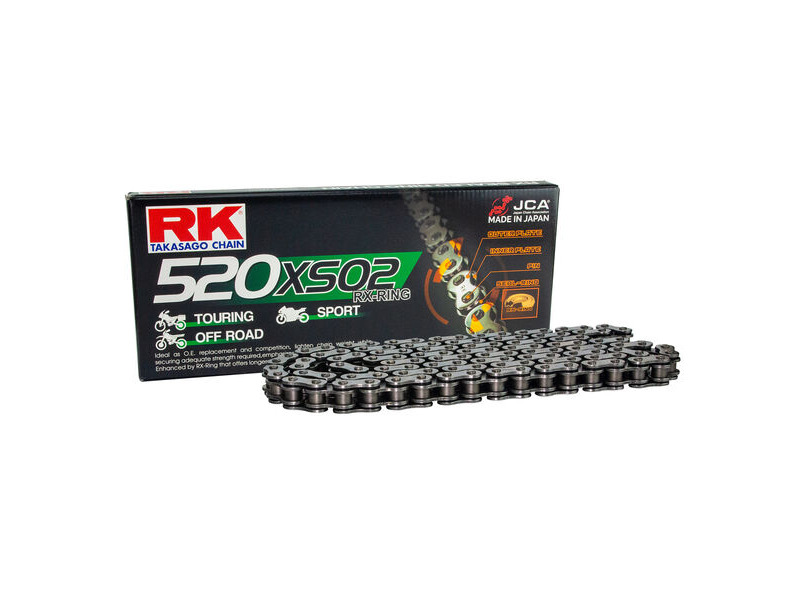 Self coloured (black) drive chainThere are many chain manufacturers in the motorcycle industry but most (including some Japanese manufacturers) only offer a single type of sealing ring, using a "one type fits all approach" which is used on all their drive chains.This can be inefficient depending on the intended use. .Different types of seals for different applications maximises efficiency and performanceRK currently has FIVE types of sealed-ring chains. Each has its own features and benefits.
