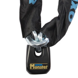 The Oxford Patriot chain lock comes equipped with an ultra strong, 12mm square link chain made from Ni-Cro-Mo alloy steel. The chain has a protective cloth sleeve to help prevent damage and make it easier to handle.The padlock features an advanced 4 way locking system and comes equipped with an extended length 14mm pin perfect for using as a chain lock. The padlock can be used as a disc lock to double security only when combined with the chain.A key replacement service is available so that if you are unfortunate enough to lose all your keys a new one can be made up. Just remember to take note of your key number and keep this in a safe place.This chain lock has undergone rigorous independent testing and has Sold Secure Motorcycle GOLD, ART 4* approval and SBSC certified product. The Oxford Patriot chain lock is resistant to attack by sledgehammer, saw, bolt cropper, drill and freeze tested. It also comes with a 2 year warranty.Chain• 12mm square link chain made from Ni-Cro-Mo alloy steel.• Case hardened chain to resist bolt cutters.• Zinc coated to prevent corrosion.• Protective cloth sleeve to help prevent damage and make it easier to handle.• Long links reduce weight and increase portability.• Fits all Oxford ground anchors.• Can be easily stowed under the seat.• Available in three lengths: 1.0m, 1.5m & 2.0m.Padlock• By design the lock body is protected within brake disc.• 14mm rotating locking pin to prevent attack.• 4 way locking system.Note: Due to the pin length the padlock cannot be used as a disc lock on its own, it should only be used in combination with the chain.